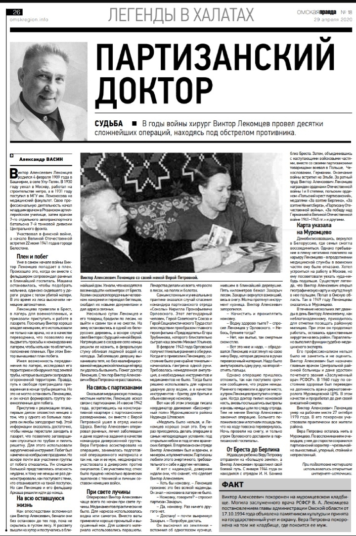 Сын Лекомцевых, Владимир Викторович (который родился в партизанском отряде), также стал врачом и работал в Муромцево. Он, как и его отец, отличался любовью к своей профессии и к людям. Моя мама не пошла по стопам своего отца, она стала учителем в школе.