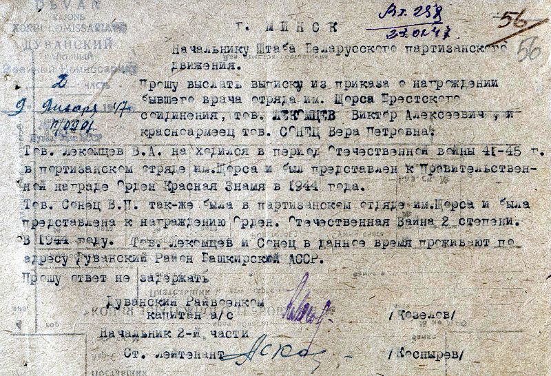 В ноябре 1941 дедушка и его фельдшер совершили побег из плена. Пробираясь от деревни к деревне, они добрались до села Куриловичи Мостовского района Гродненской области и здесь остались на зиму, с ноября 1941 года по май 1942 года обслуживая жителей этих мест как медики. Там Лекомцев встретился со своей будущей женой — Верой Петровной Сонец. С мая 1942 года Лекомцев вместе с Верой Петровной ушёл в отряд имени Щорса, которым командовал П. В. Пронягин. Отряд действовал на территории Брестской области. Здесь, оставаясь врачом, стал минёром, пулемётчиком. С октября 1942 г. — врач диверсионного отряда Бринского. Главной заботой Лекомцева в отряде Бринского был лазарет, но он также ходил на задания с оперативными группами, участвовал в боевых операциях, в том числе в диверсиях на железной дороге. Бабушка всегда ассистировала деду на операциях, делала перевязки, а также участвовала в диверсиях.